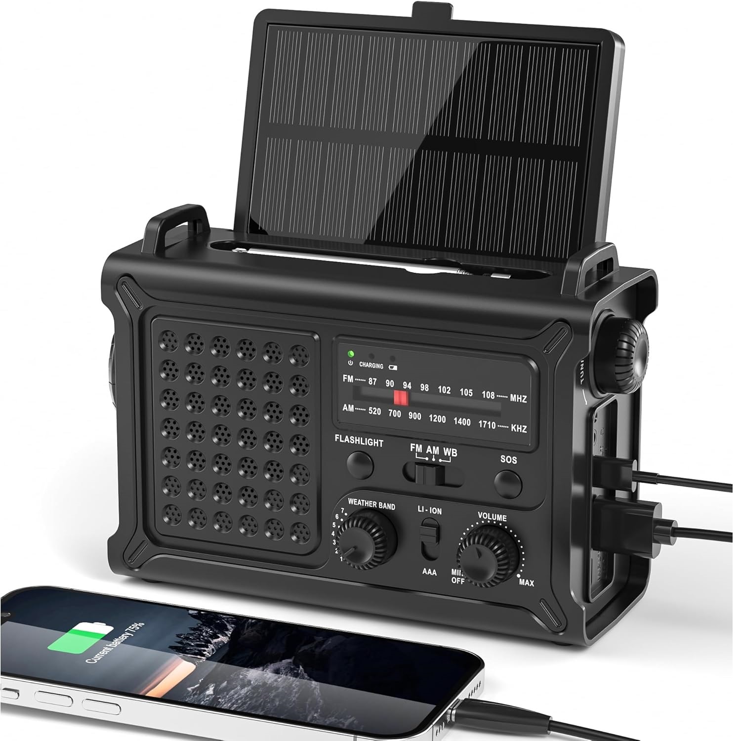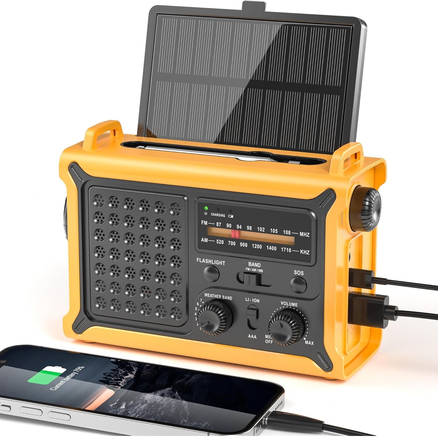 إشارة واضحة، راديو طقس يعمل بالبطارية، يدعم موجات AM وFM وNOAA، مزود بمصباح LED ثنائي الوضع، وشاحن هاتف محمول، ومخرجين، وزر استغاثة (SOS).